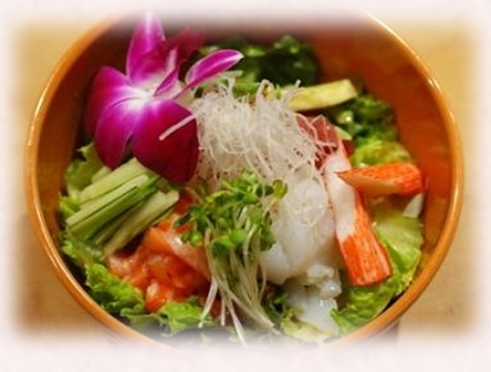 Assorted Sashimi grade Fish served on bed of White Rice with chopped Red Leaf Letuce topped with Cucumbers, Crab Stick, Sesame Oil, Daikon & Chili Sauce on the side.