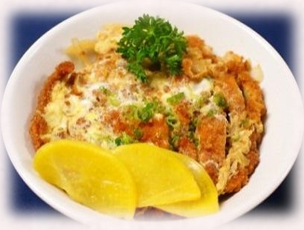 Breaded Port Loin simmered in a Special Sauce with Onions, Scallions, Egg & Rice on the bottom.