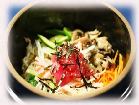 Sashimi grade Tuna & 6 Types of Seasoned Vegetables served with Rice & Chili Sauce.